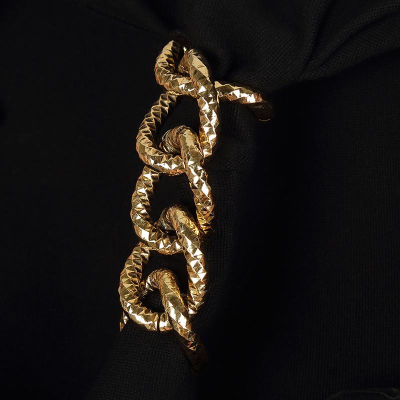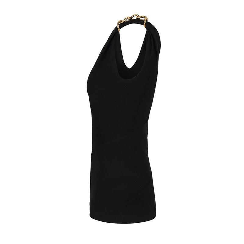 黑色Punto Milano无袖不对称上衣,一条肩带饰有金色刻面金属宽链节链条,胸前饰有立体螺旋效果缝线。