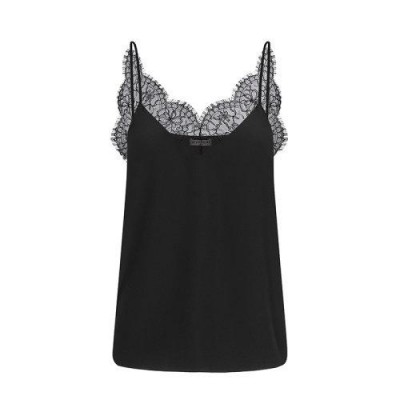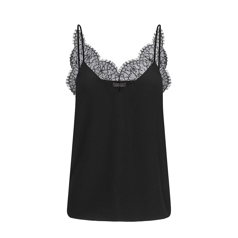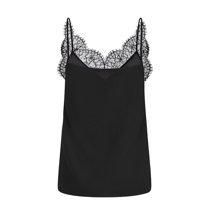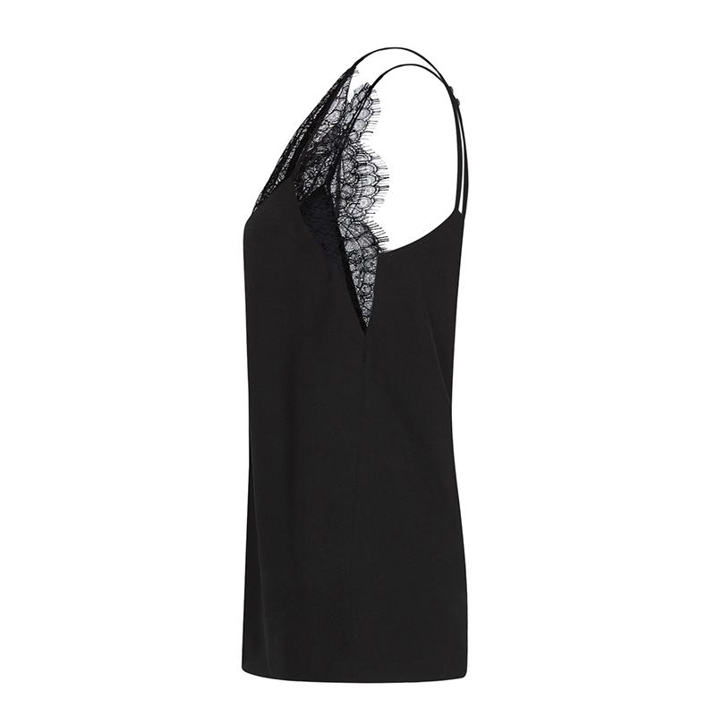黑色细吊带V领背心,黑色蕾丝镶饰环绕领口。