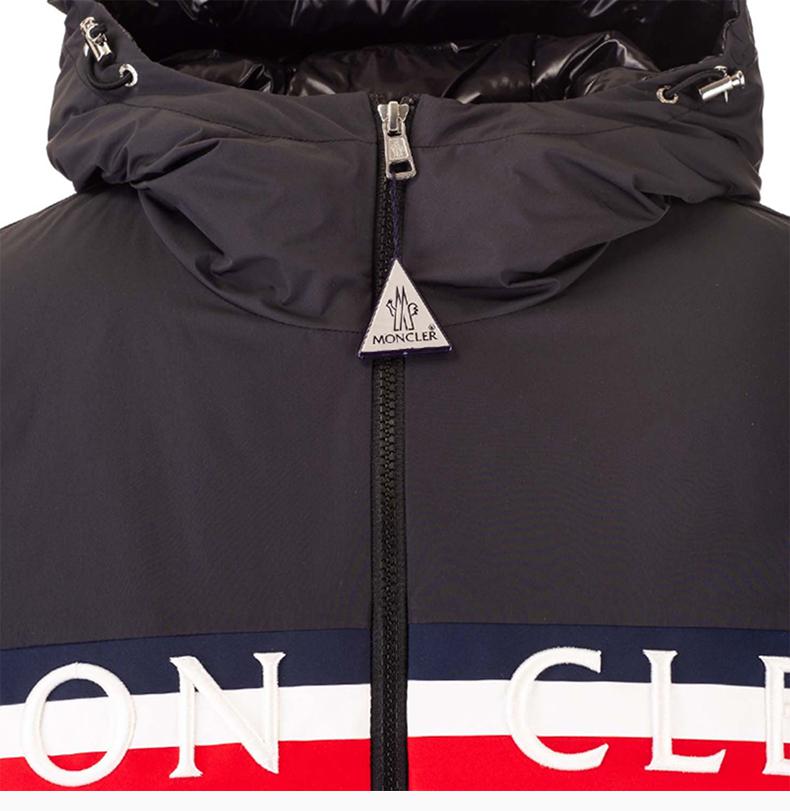 Moncler/蒙克萊男士服裝黑色連帽字母LOGO藍白紅條紋拉鍊口袋短款羽絨服男士羽絨服