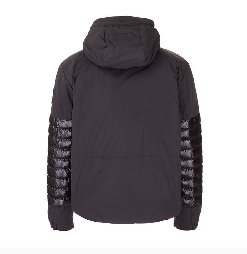 Moncler/蒙克莱 男士 服装 黑色连帽字母LOGO蓝白红条纹拉链口袋短款羽绒服 男士羽绒服