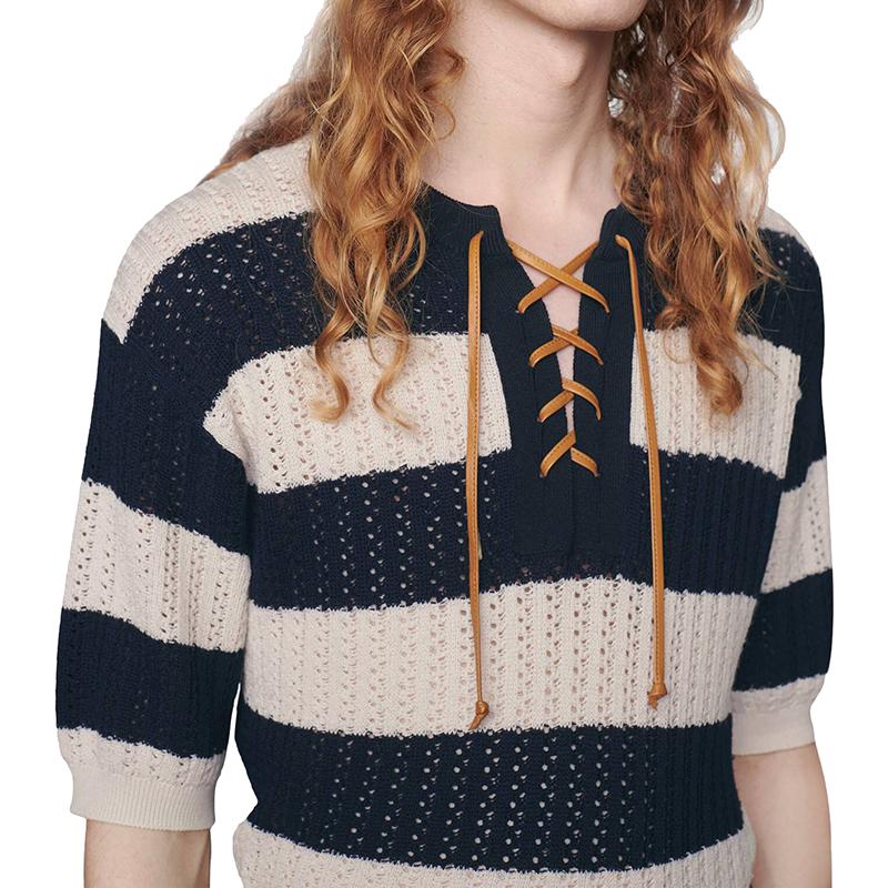 条纹风格完善了Epilogue系列的服装,例如,这款深蓝色和米白色条纹羊毛polo衫,带有系带项圈和皮绳,带来意想不到的触感。蓝色和红色GG细节面板绣有标志性的颜色组合,增强了正面效果。