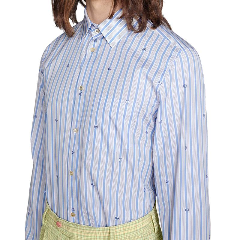 浅蓝色fil双门轿跑车GG条纹图案是Gucci系列中经常出现的细节,并装饰了这款白色棉质衬衫,其特点是尖领和圆形袖口。