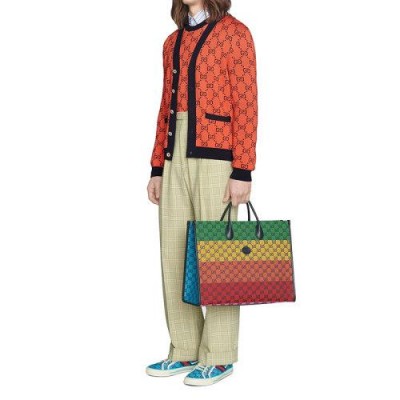 在GG Multicolor胶囊系列中,原始的会标图案是近一个世纪以来富有创造力的创作基础,上面装饰着蓝色,并装饰了一系列成衣,手袋以及鲜艳的配饰。在这里,这些颜色组合起来,形成了对比鲜明的羊毛和棉质针织开衫。