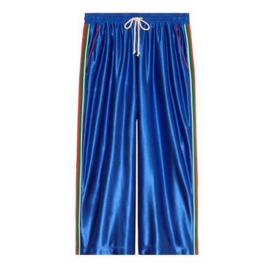 闪亮面料突破传统规则束缚,在无边序曲系列中探索全新用途和设计。这款运动装风格的慢跑长裤由质感柔软的闪亮平纹针织聚酯纤维面料制作而成。蓝色面料宛若画布般点缀丰富装饰细节,包括马术风格织带和Gucci复古标识,打造令人惊艳的设计。