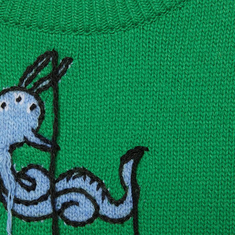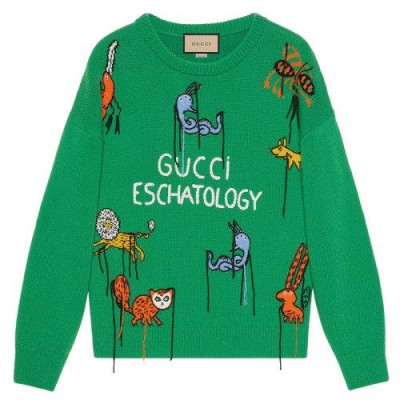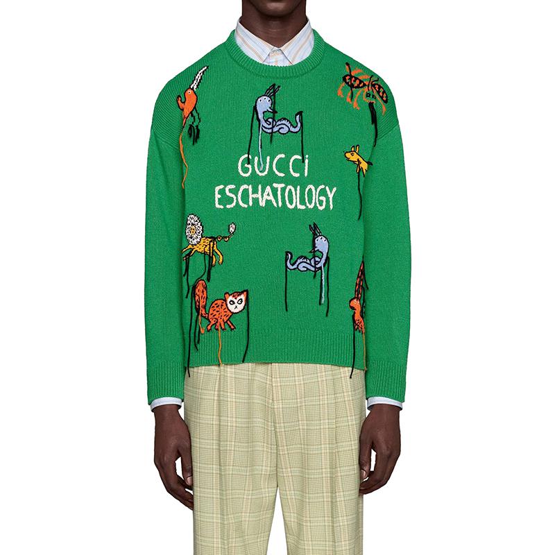 由英国儿童读物插画家弗雷亚·哈塔斯(Freya Hartas)想象,一系列受到神话世界启发的动物角色邀请Overture系列来庆祝讽刺和诗歌。这款绿色羊毛毛衣上的动物与“ Gucci Eschatology”刺绣搭配使用,Eschatology指的是一种探索人与宇宙最终命运的学说。