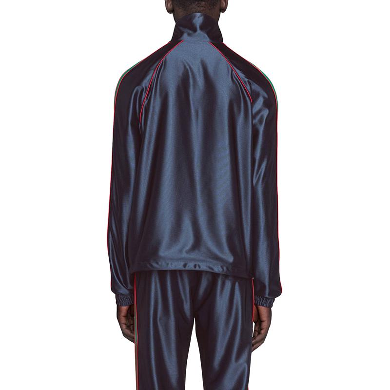 在整个Opening系列中,邀请了违反规范的闪亮面料。这款运动服式夹克采用柔软闪亮的技术涤纶平纹针织面料制成。迷人的深蓝色织物像帆布一样,展示了标志性的细节,例如马术风格的织带和GG细节轭。