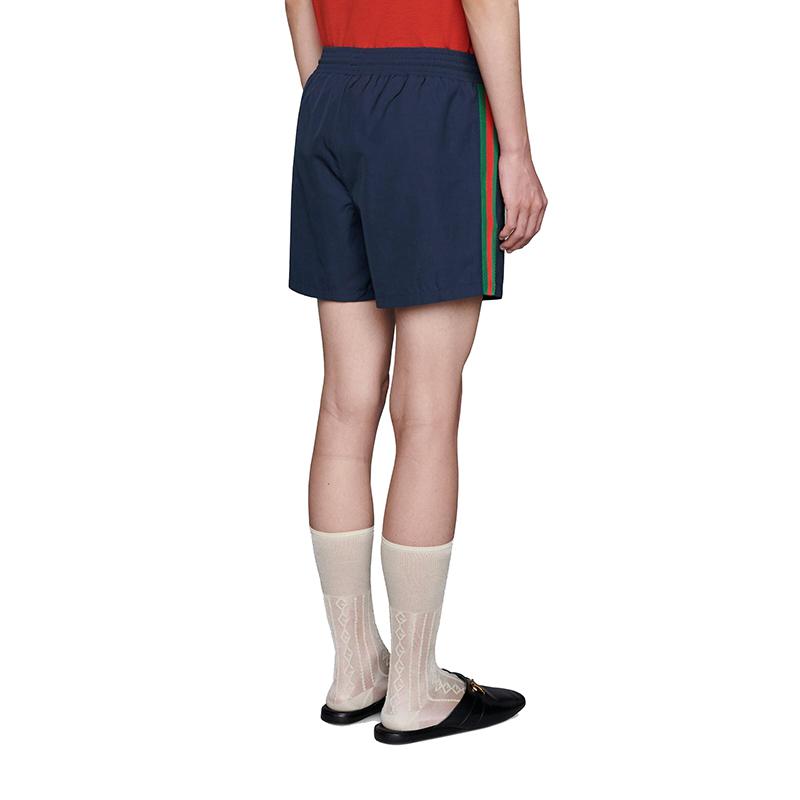 这款游泳短裤由防水尼龙制成,带有松紧腰带和抽绳。两侧的绿色和红色织带带给Gucci提花商标带来运动感。