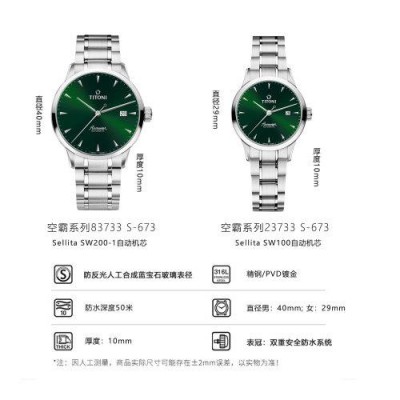 TITONI/梅花瑞士手表 空霸系列 时尚优雅休闲商务款 自动机械男女款 情侣表 对表 绿盘钢带 23733/83733 S-673