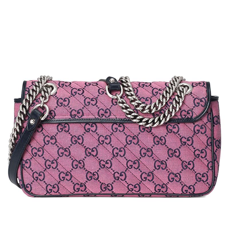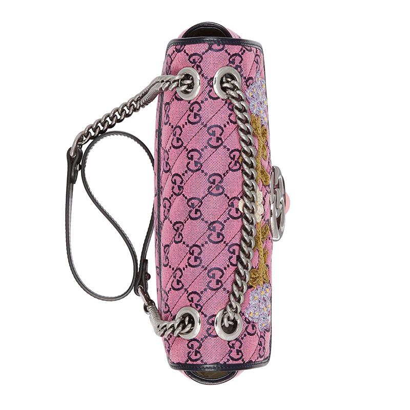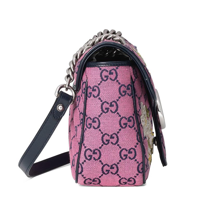 【包稅】GUCCI/古馳2021春夏新款GG Marmont‎系列小號女士粉色和藍色GG帆布花卉貼花銀色飾面雙G扣斜挎單肩手提包‎4434972UZNN5286