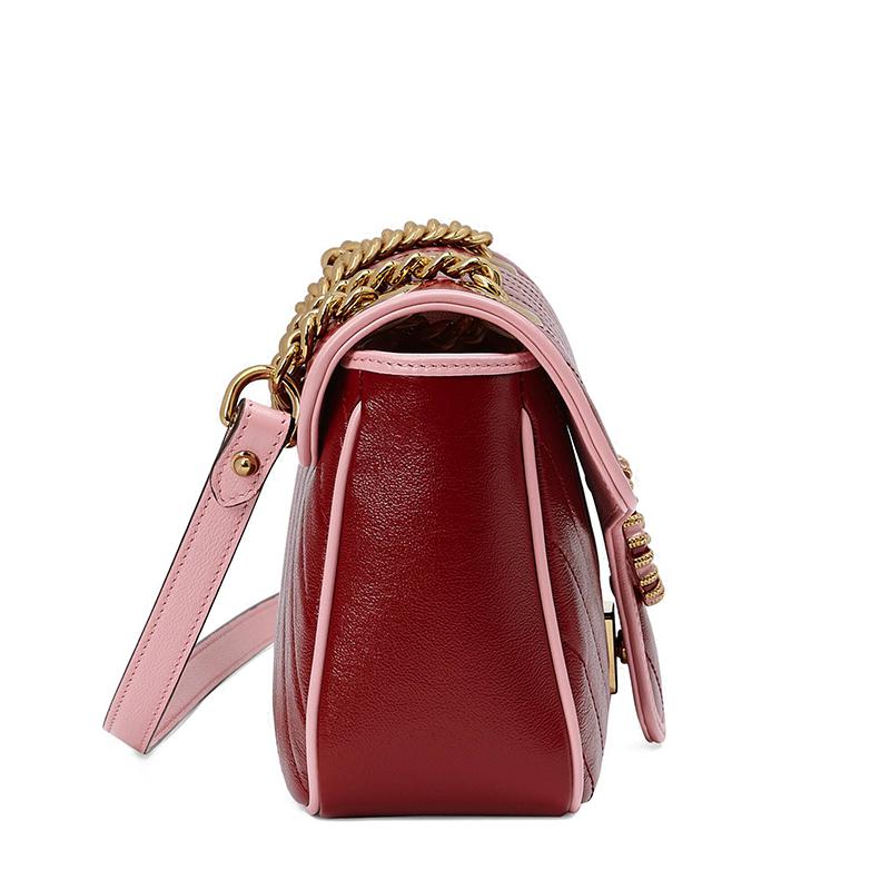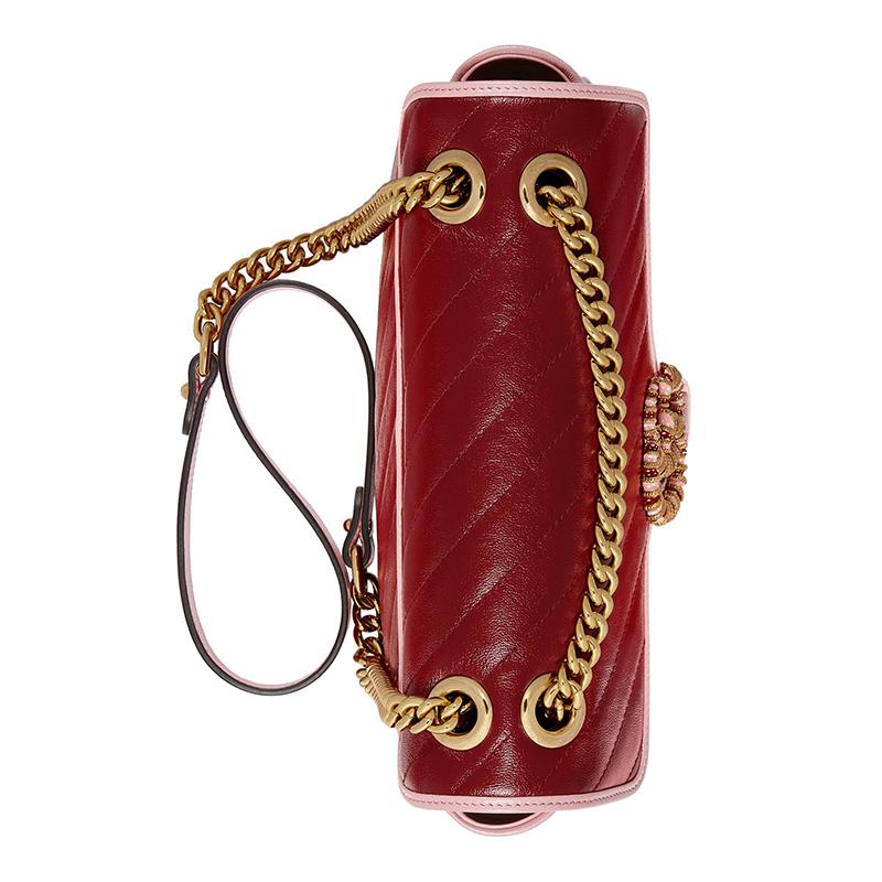 GG Marmont皮革以深红色的阴影和精致的柔和粉红色完成,让人回想起珍贵的红宝石的颜色。单肩包以其标志性的Double G细节为特色,并增加了色调细节。