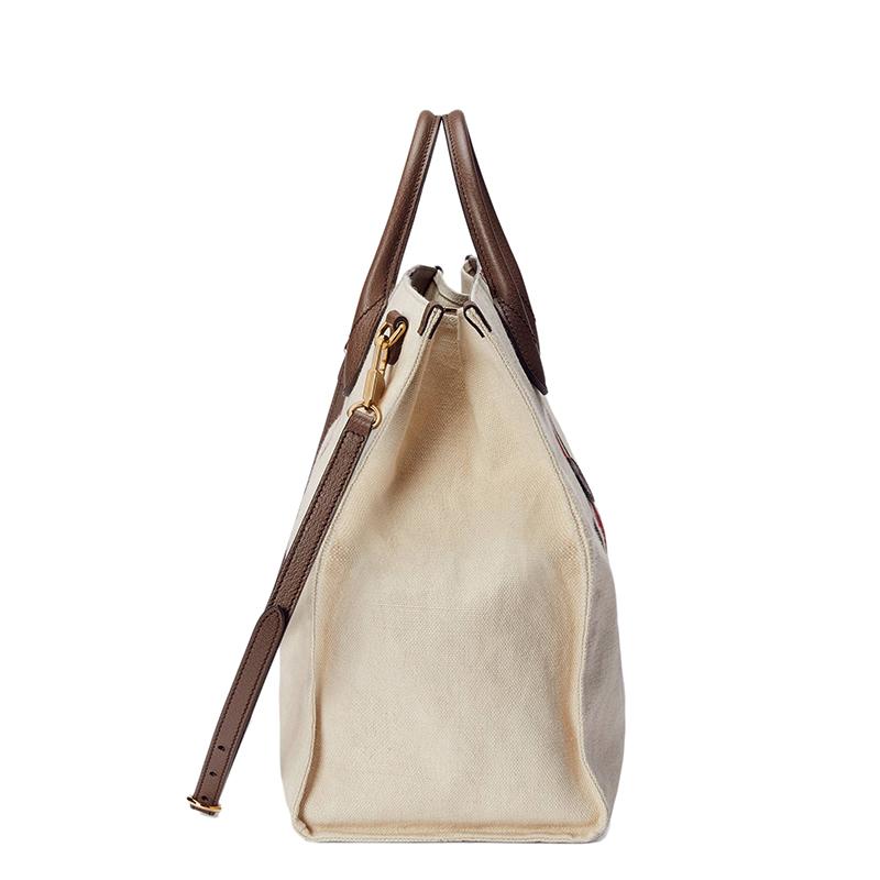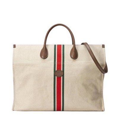 【包稅】GUCCI/古馳21春夏新款pliable系列大號米色亞麻帆布紅綠條紋細節棕色皮革手柄單肩手提包‎6588762U2AG8686