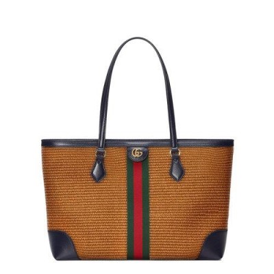 【包稅】GUCCI/古馳21春夏新款Ophidia系列中號駝色稻草編織藍色皮革飾邊紅綠條紋裝潢單肩手提包6316852SXFG9368