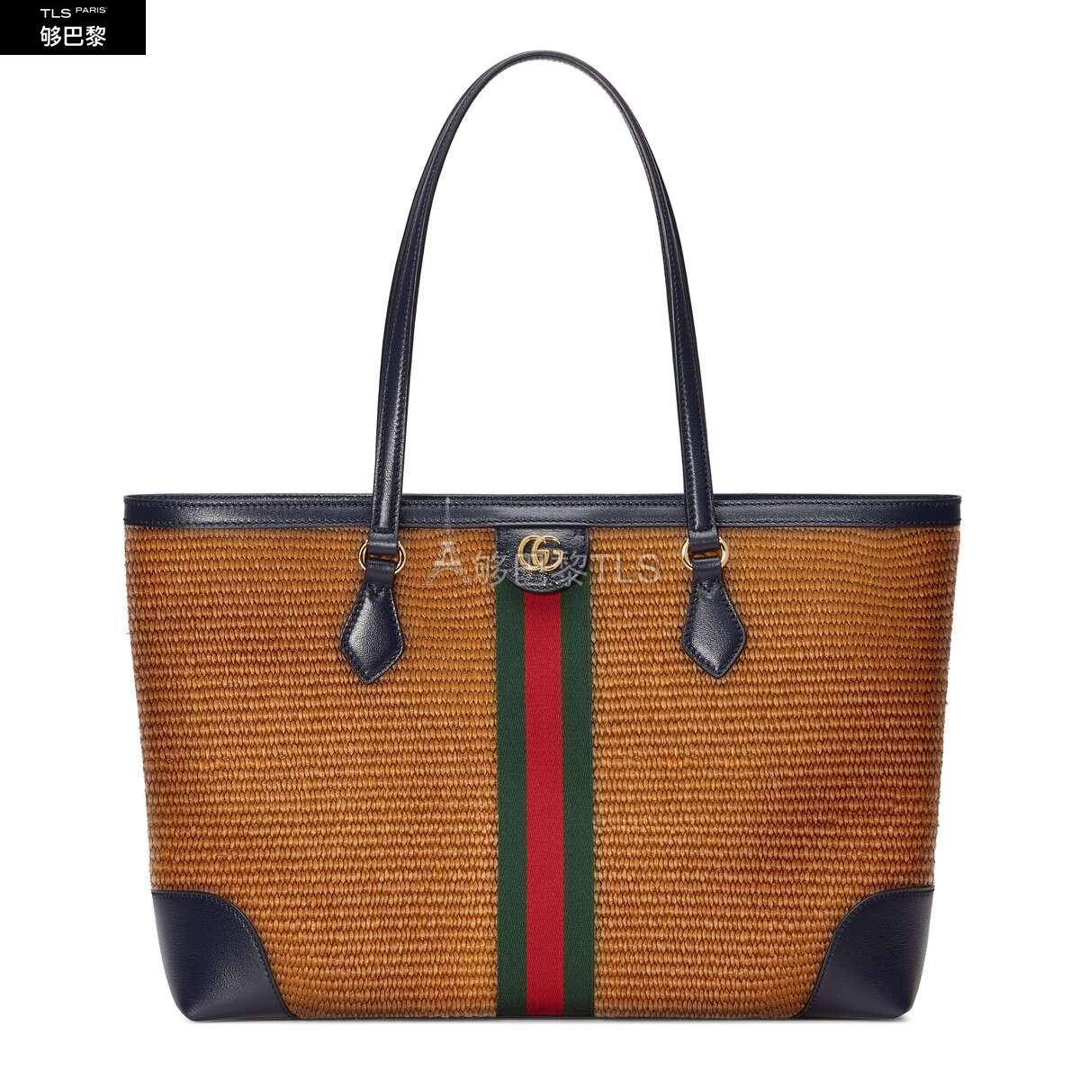 草编效果材质令品牌的标志性设计散发出精致优雅的夏日风情。这款Ophidia系列中号托特包采用驼色配色,搭配品牌经典条纹织带细节。
