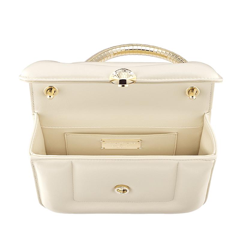 Mary Katrantzou x Bvlgari手提包采用柔软的缝纳帕皮制成,乳白色的象牙白,内部衬里为乳白色的纳帕皮革。新款Serpenti金色黄铜表扣,迷人的水晶眼睛。特别版本。