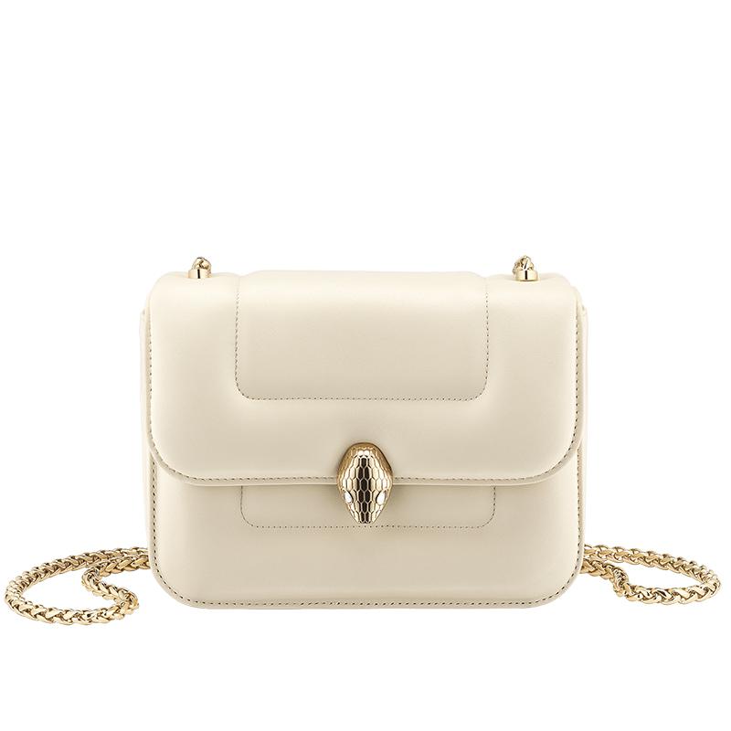 【包稅】預售一個月BVLGARI/寶格麗MARY KATRANTZOU聯名靈蛇蛻變女士白色柔軟納帕皮Serpenti金色黃銅錶扣水晶蛇頭單肩斜挎手提包291074