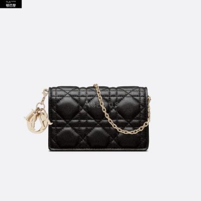 La nano pochette Lady Dior est un accessoire elegant et tres actuel. Sa texture *w*matelassee instantanement reconnaissable est ici declinee en cuir d'agneau noir et se rehausse d'un charm "D.I.O.R" en metal dore pale. Le compartiment interieur permettra d'accueillir cles et monnaie. Cette piece modulable possede une chaine amovible pour un porte en crossbody ainsi que deux passants a l'arriere lui permettant de se fixer a vos ceintures pour en faire un accessoire nomade.