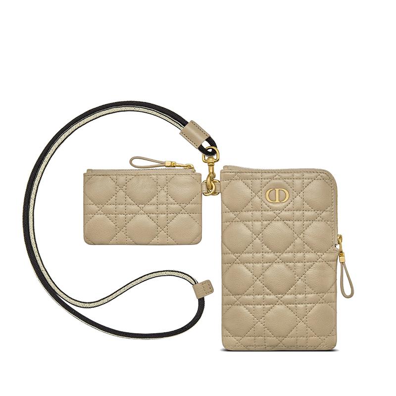 Dior Caro多功能离合器是柔软的绳色小牛皮的混合产品,并通过标志性的Cannage针脚进行了改进。它由两个可分离的拉链元素组成。小口袋可存放钥匙或找零,而更宽敞的口袋可存放电话。可拆卸的抽绳可将其斜挎在脖子上,也可将其单独放入袋中。