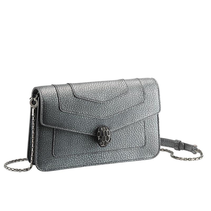【包稅】BVLGARI/寶格麗2021春夏新款SERPENTI FOREVER系列女士灰色山羊皮黑色珐琅蛇頭扣鏈式錢包290850