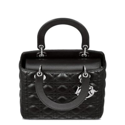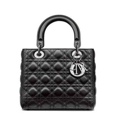 Lady Dior手提包体现了Dior家居优雅和美丽的景象。精致而女性化,这种永恒的创作仍然流行。它采用black缝的黑色小羊皮制成,缝的纹理可立即识别,并配以同色麂皮内饰。DIOR钌金饰物带来优雅气息。Lady Dior中号手提包配有细细可移动的皮革表带,可以手提在肩上或斜挎包上。