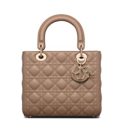 Lady Dior手提包体现了Dior家居优雅和美丽的景象。精致而女性化,这种永恒的创作仍然流行。它采用灰褐色小羊皮和Cannage缝线制成,缝纹理可立即识别。DIOR吊饰以音色珐琅装饰,散发出优雅的魅力。Lady Dior中号手提包配有细细可移动的皮革表带,可以手提在肩上或斜挎包上。