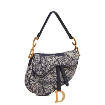 标志性的马鞍包由Maria Grazia Chiuri带来。它采用提花帆布制成,采用蓝色Toile de Jouy Reverse,通过倒置配色方案呈现品牌的标志性图案。它具有传奇色彩的设计包括带有磁性D形环扣的Saddle翻盖,以及在过时的金色金属手柄两侧的CD签名。该马鞍包既可以手提也可以背在肩上,并可以使用不同的肩带进行个性化设置。