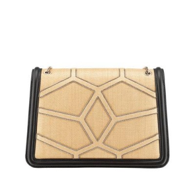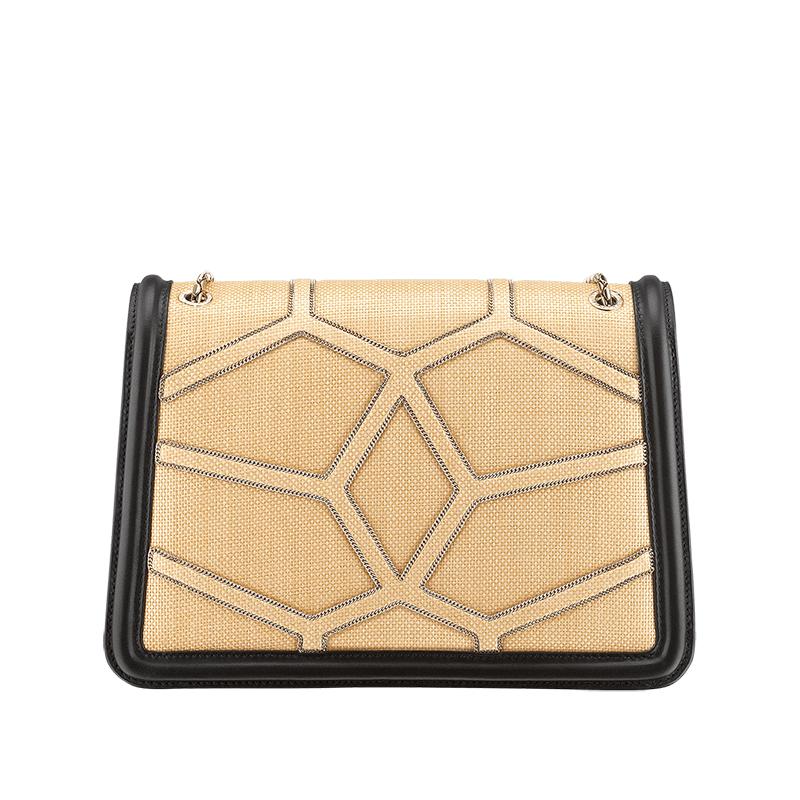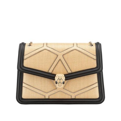 【包税】BVLGARI/宝格丽 2021春夏新款 SERPENTI FOREVER系列 女士米色酒椰叶纤维黑色小牛皮边缘金色黄铜蛇头表扣单肩斜挎手提包290904