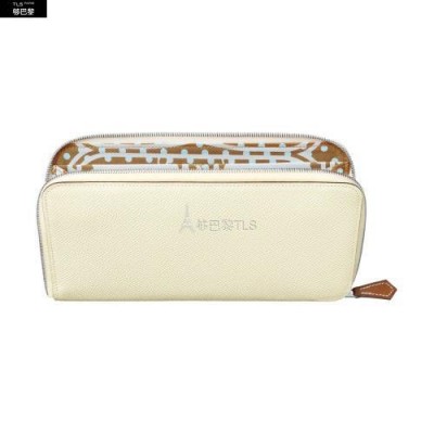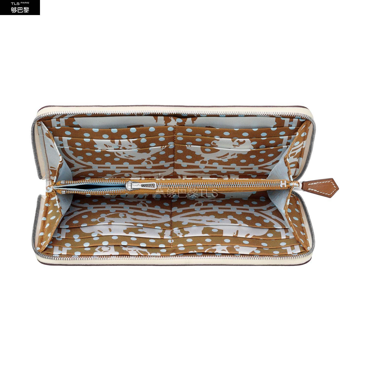 Portefeuille combine en veau Epsom et veau Barenia, double en twill de soie imprime « Brides de gala fantome a pois », fermeture a glissiere argentee palladiee.A l'interieur: une poche monnaie zippee, quatre poche*es et douze poches cartes de credit