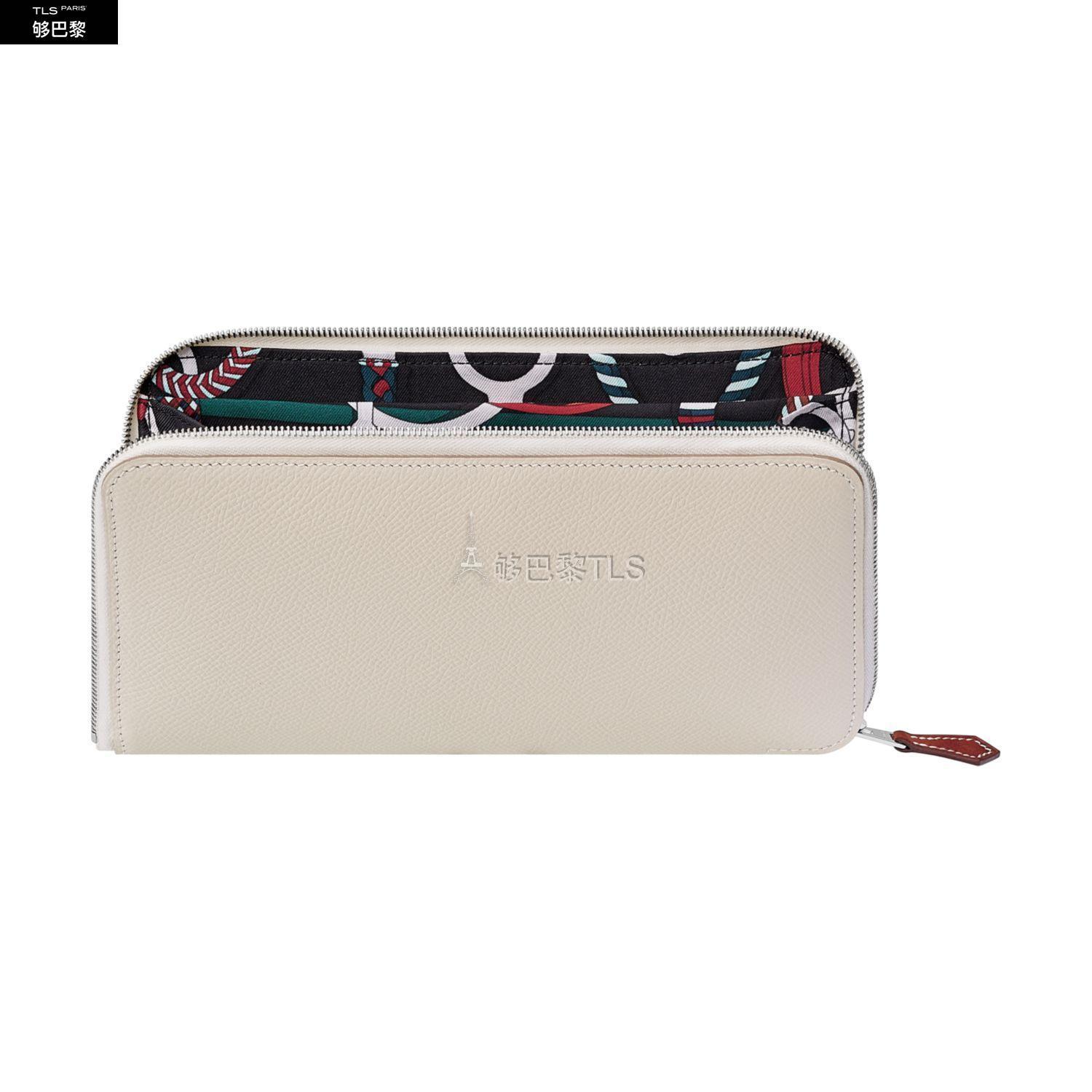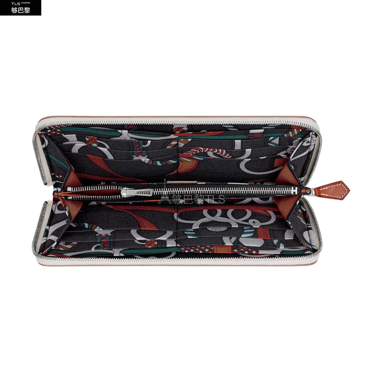 Portefeuille long zippe en veau Epsom, double en twill de soie imprimee « Panoplie equestre », fermeture a glissiere argentee palladiee a l'interieur : un porte-monnaie zippe, douze poches cartes de credit et quatre poche*es
