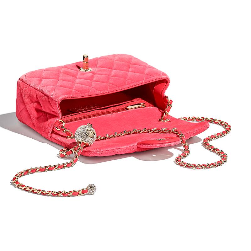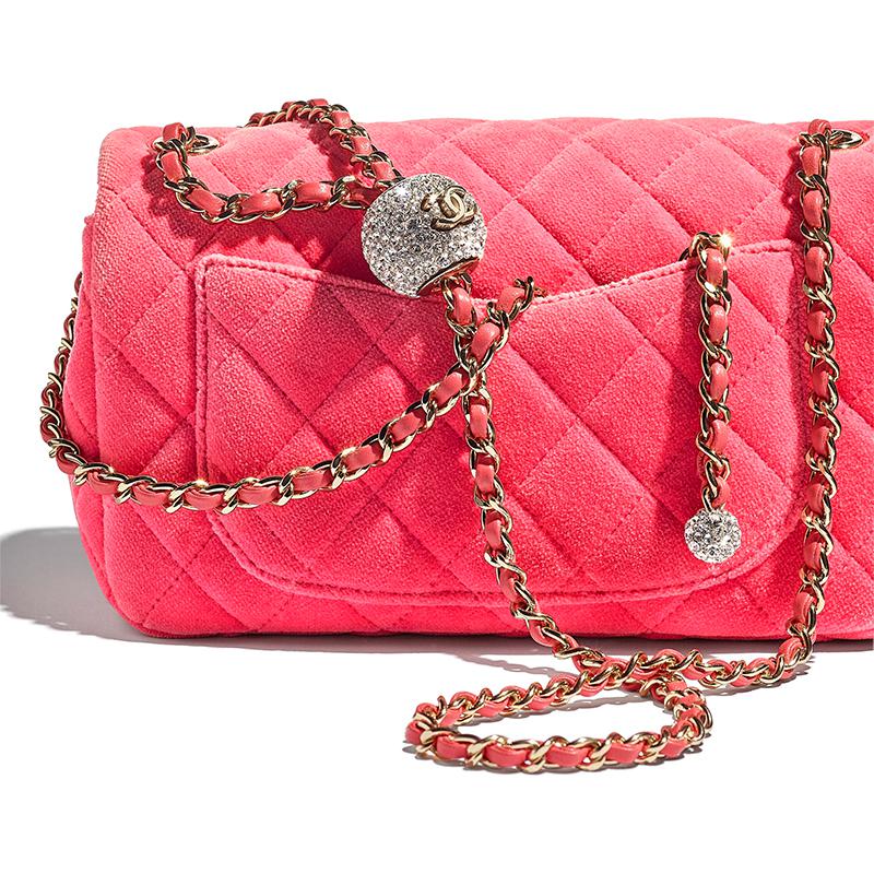 【包税】CHANEL/香奈儿 2020秋季爆款新款 粉色丝绒可调节金链点缀水晶球双C斜挎单肩包