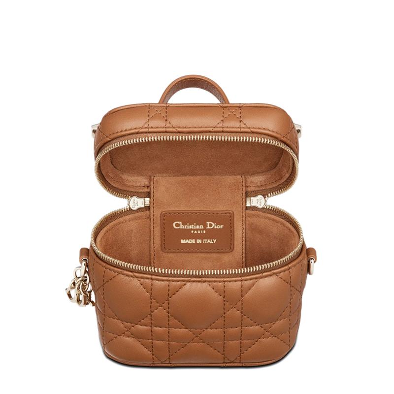 Lady Dior虚荣心本季有微型尺寸。Cannage明线缝制和可拆卸的DIOR魅力增强了白兰地色小羊皮制成的手感。它的拉链开合打开后会进入主隔层,该隔层可容纳您的必需品。这款梳妆台非常适合日常使用,并且由于其手柄和可拆卸的肩带,可以用手托在肩膀或斜挎包上。