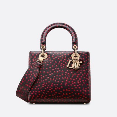 Le sac Lady Dior incarne parfaitement la vision d'elegance et de beaute de la maison Dior. Raffinee et feminine, cette creation intemporelle est pourtant toujours actuelle. Confectionne en cuir de veau, ce modele presente le motif I Love Paris bleu marine et coeurs rouges texture. Les charms D.I.O.R. en metal dore pale s'accompagnent d'un charm coeur habille d'email, tel un echo au motif. Dote d'une large bandouliere amovible, ce sac Lady Dior medium pourra etre porte a la main, a l'epaule ou crossbody.