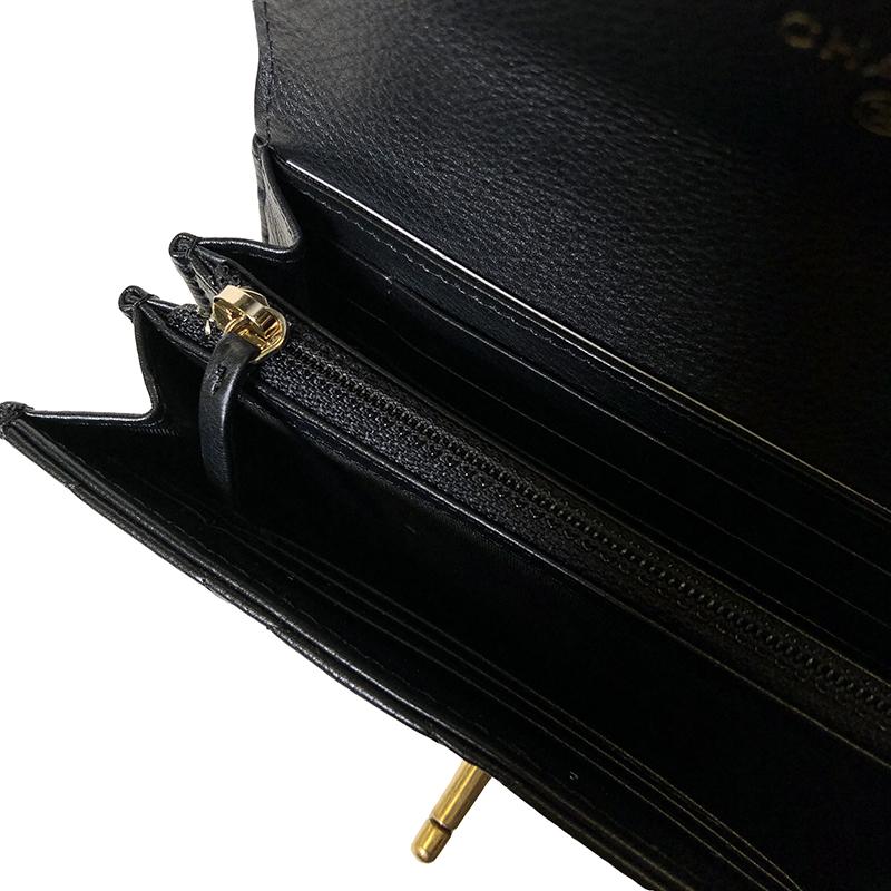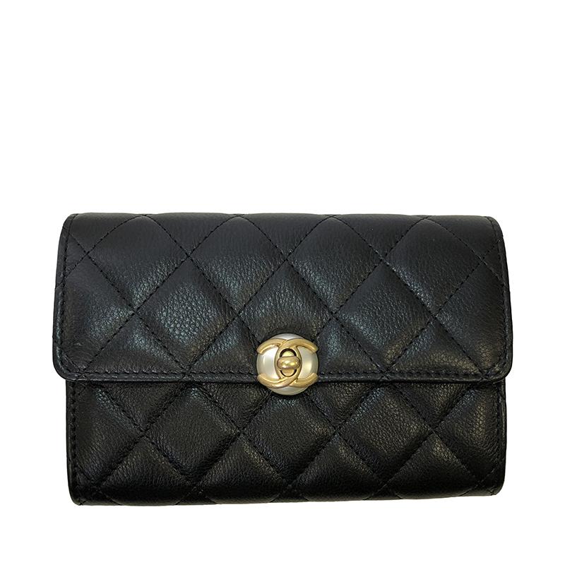 【包郵包稅】CHANEL/香奈兒經典款黑色自然紋理皮革白色樹脂珍珠飾金色金屬雙C扣錢包