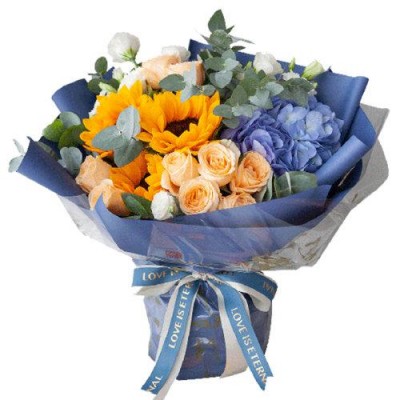 首頁 > 鮮花綠植 > 花禮 > 花禮/星河璀璨/香檳玫瑰9枝、藍繡球、向日葵、白色洋桔梗、大葉尤加利/七夕情人節禮物鮮花/當日達