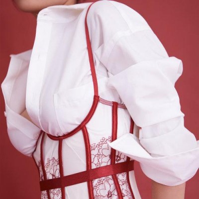 【21春夏】AuroraAlba情人節綻放酒漬玫瑰色網紗刺繡花邊骨衣