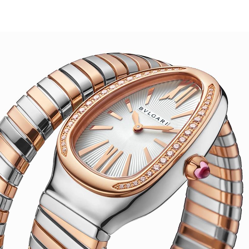 首頁 > 箱包配飾 > 寶格麗 > 【包稅】預定2-3周BVLGARI/寶格麗鑲有明亮切割鑽石的18K金玫瑰金表圈和不銹鋼單螺旋手鏈銀色不透明錶盤SERPENTI TUBOGAS石英手錶35毫米102237