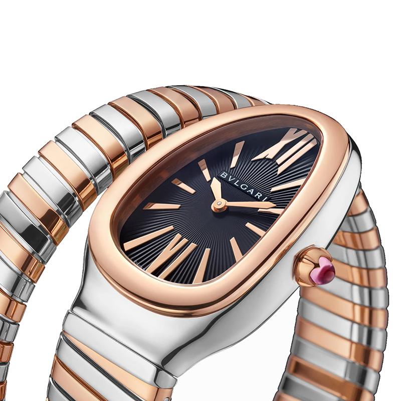 Serpenti Tubogas手表结合了Bulgari的两个标志性设计符号,将蛇形起伏的诱惑力与Tubogas技术的现代精神相结合。这款钟表唤起女人的性感曲线和蛇形起伏的身体,其曲线归功于这种特殊的技术,其特点是轻巧灵活的管状形状。这款腕表迷人而独特,标志着Serpenti不断发展的转折点。Serpenti Tubogas石英机芯手表,35毫米弧形不锈钢表壳,18 K金玫瑰金表圈,18 K金玫瑰金表冠,镶嵌凸圆形切割的粉红色红宝石,黑色乳白色表盘,经过日光扭索饰纹和实用索引手工制作的18克拉玫瑰金和不锈钢螺旋形手链。