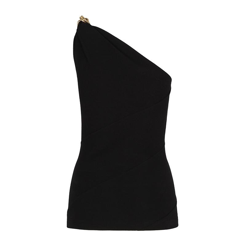 黑色Punto Milano无袖不对称上衣,一条肩带饰有金色刻面金属宽链节链条,胸前饰有立体螺旋效果缝线。