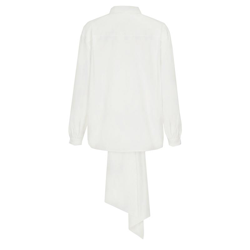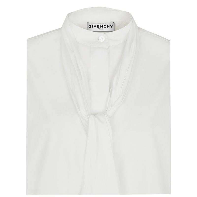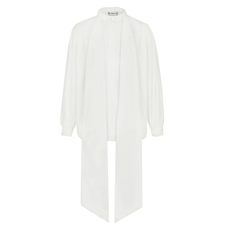 纯白色真丝提花衬衫,饰有GIVENCHY链条图案,围巾领,长泡泡袖,同系配色罗纹针织袖口。