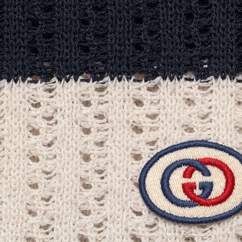 条纹风格完善了Epilogue系列的服装,例如,这款深蓝色和米白色条纹羊毛polo衫,带有系带项圈和皮绳,带来意想不到的触感。蓝色和红色GG细节面板绣有标志性的颜色组合,增强了正面效果。