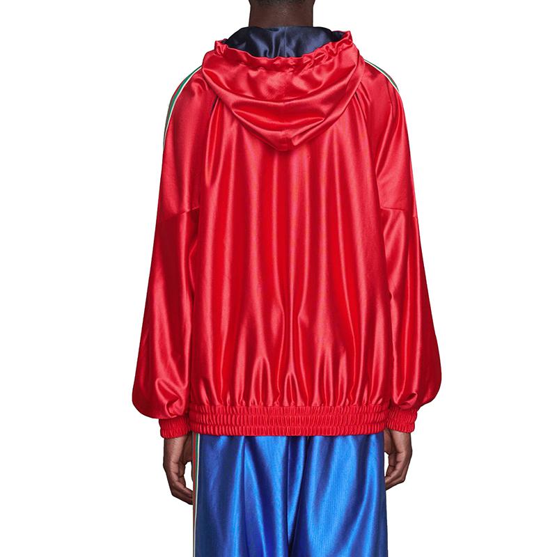 在整个Opening系列中,邀请了违反规范的闪亮面料。这款运动服式连帽运动衫采用柔软闪亮的技术涤纶平纹针织面料制成。令人着迷的亮红色织物具有帆布效果,展示了标志性的细节,例如马术风格的网状条纹和古驰(Gucci)徽标。