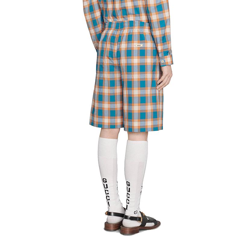 这些短裤由柔和色调的蓝色和橙色Madras格纹图案定义,散发出独特的复古感。腰部有抽绳的模型配有Gucci标签。