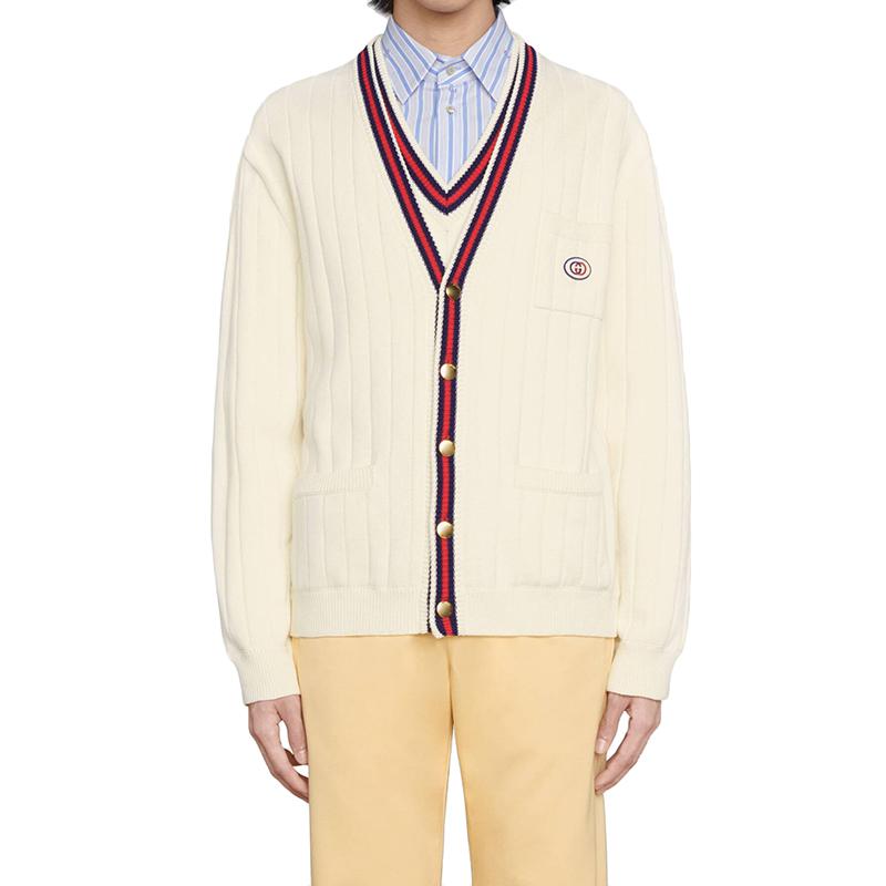 【包稅】GUCCI/古馳21年早秋新款男士象牙色織帶棉質針織V領開衫654984XKBUR9182