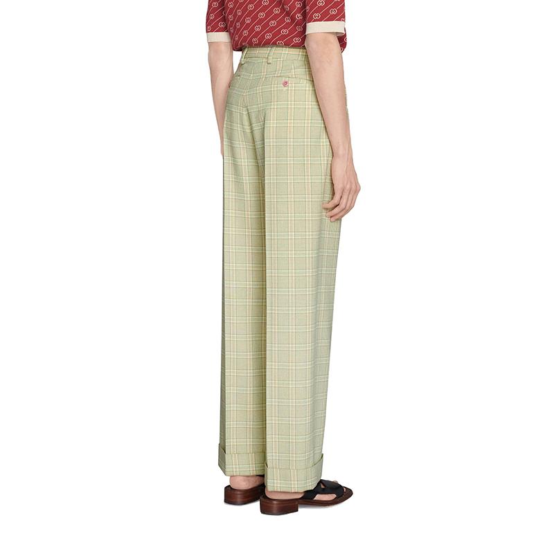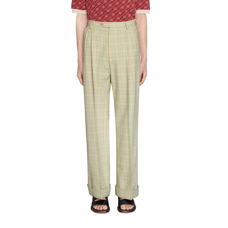 【包稅】GUCCI/古馳21年早秋新款男士米色和綠色格子呢圖案羊毛混紡長褲653360ZAFVF9672