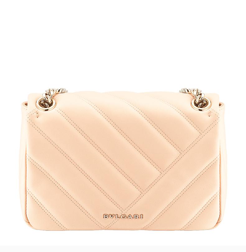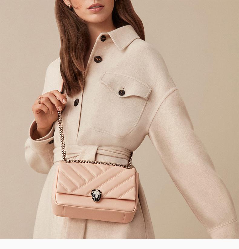 【包稅】BVLGARI/寶格麗SERPENTI CABOCHON系列女士蜜桃色絎縫小牛皮淺金鍍金黃銅黑白珐琅經典蛇首扣單肩包斜挎包鏈條包女包290612