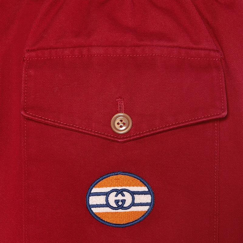 这款红色慢跑裤饰有军用棉质滴答连衣裙,脚踝处饰有带扣,并饰有复古Gucci徽标贴片。田径服精神中的褪色效果轮廓体现了theouverture系列所探索的更多可能性。