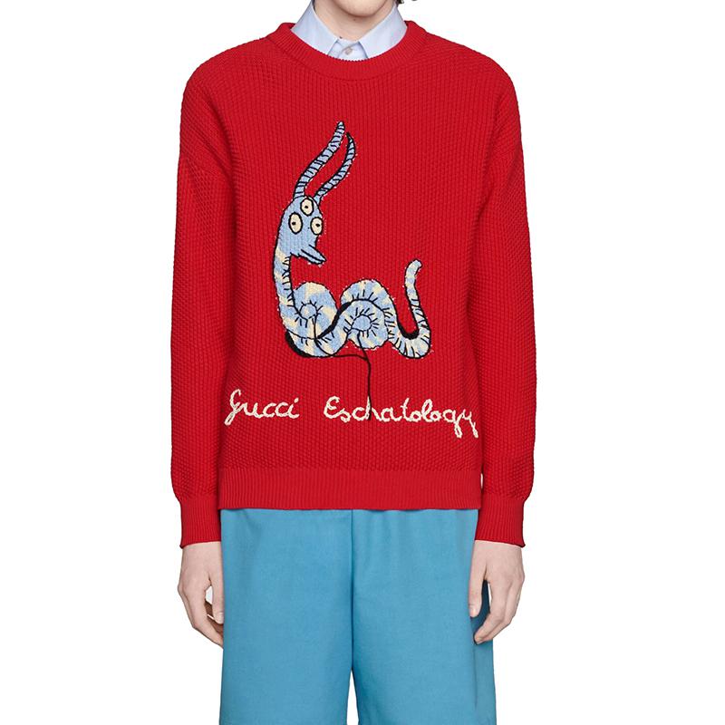 由英国儿童读物插画家弗雷亚·哈塔斯(Freya Hartas)想象,一系列受到神话世界启发的动物角色邀请Overture系列来庆祝讽刺和诗歌。这款绿色羊毛毛衣上的动物与“ Gucci Eschatology”刺绣相关联,Eschatology指的是一种探索人与宇宙最终命运的学说。
