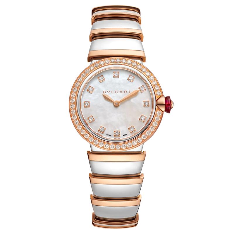 【包税】预定2-3周 BVLGARI/宝格丽 18k金t玫瑰金表圈 镶有明亮式切割钻石 白色珍珠母贝表盘 钻石时标和不锈钢手镯 LVCEA石英手表 28毫米102475