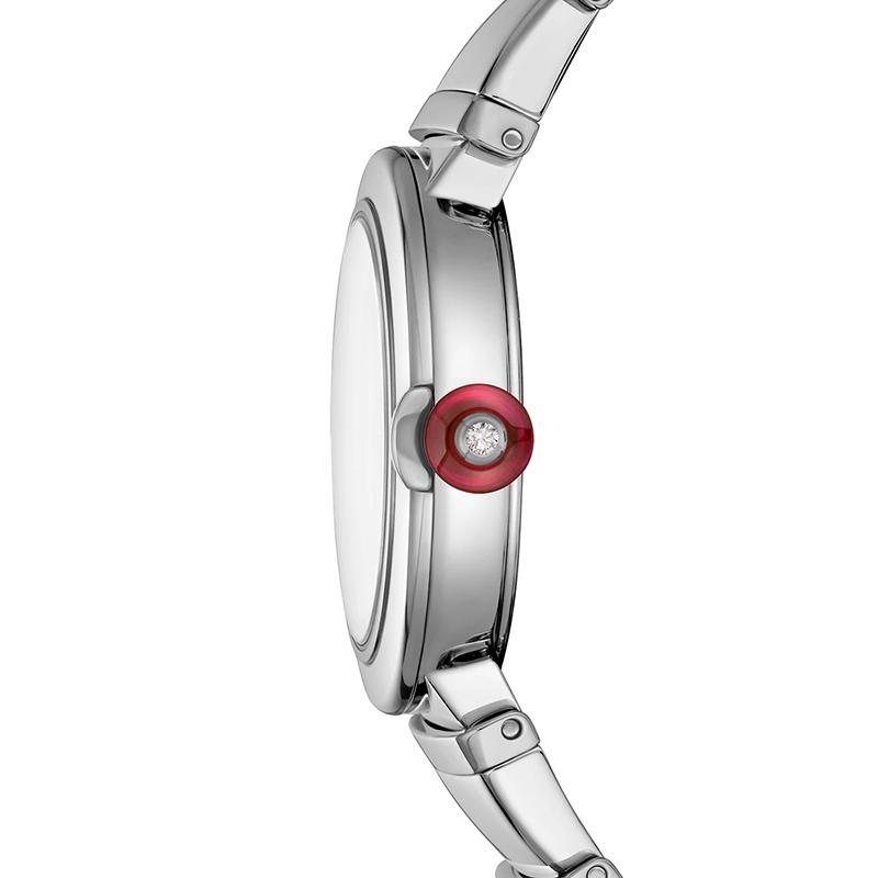 受光与时间之间不可分割的联系的启发,LVCEA向日d致敬,日sun是植根于古罗马传统的古老的时间测量工具之一。LVCEA在意大利以“ luce”作为光的力量的体现,以其结合传统与现代的圆形表壳的光彩夺目。每一枚时计的表冠均镶有彩色宝石,是罗马珠宝商的特色标志。LVCEA石英机芯手表,28毫米不锈钢表壳,带凸圆形切割合成红宝石和钻石的不锈钢表冠,白色珍珠母贝表盘,镶有钻石的指针和不锈钢表链。