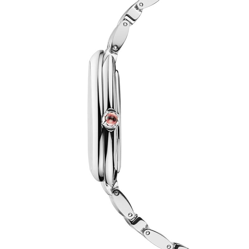 Serpenti Seduttori手表以其精巧的材料而耀眼,使时间变得更加珍贵。以全新设计重现宝格丽无可争议的诱人图标,这款标志性的水滴形手表比以往任何时候都更薄,并配有六角形刻度图案的感性手镯,具有高的柔韧性。诱人的美学和对珠宝魅力的致敬:这款表彰显了蛇的诱人魅力。Serpenti Seduttori手表,石英机芯,33毫米不锈钢表壳,不锈钢表冠,镶嵌凸圆形切割的粉红色红宝石,银白色乳白色表盘,不锈钢表链和折叠式表扣。