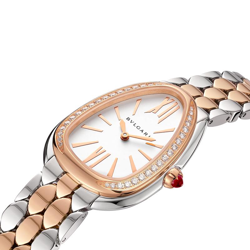 Serpenti Seduttori女士手表,石英机芯,33mm不锈钢表壳,18K金玫瑰金表圈镶有钻石,18K金玫瑰金表冠镶有凸圆形切割的粉红色红宝石,白色表盘和玫瑰金手链18 K和不锈钢。防水深度达50米。